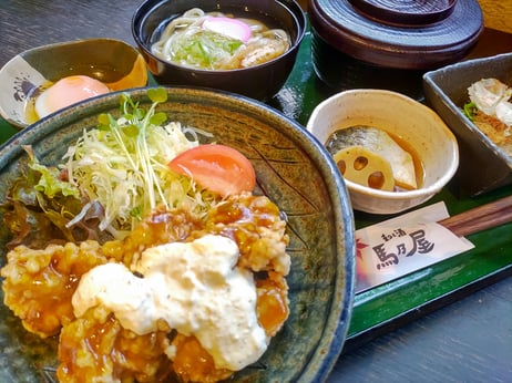 セット内容 チキン南蛮+サラダ 小鉢二種 温泉卵or漬物 讃岐うどんor味噌汁