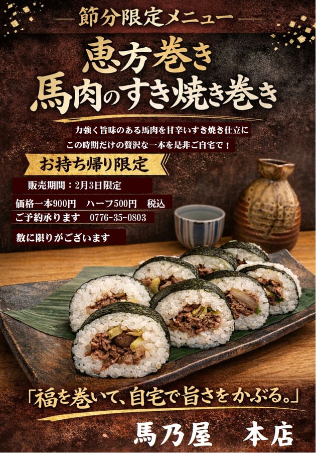 馬乃屋本店にて恵方巻のご予約承ります!午年には馬肉の恵方巻を是非!(詳しくは下記参照)